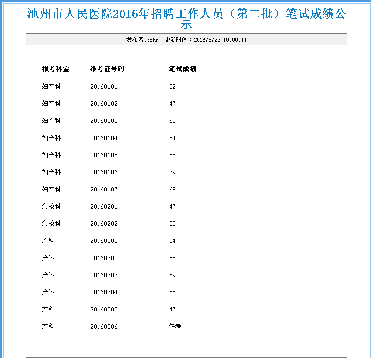 池州市人民医院2016年招聘工作人员(第二批)笔试成绩公示