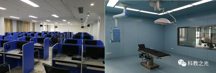 科教楼教学活动用房共有 6000 余平米。内设临床技能模拟训练中心实践技能考核中心、多媒体教室、图书馆。包括内、外、妇、儿、急救等各类教学模型、临床思维训练及考试系统。以及音响、交互式平板、电子白板、录播直播等电化教学设备。