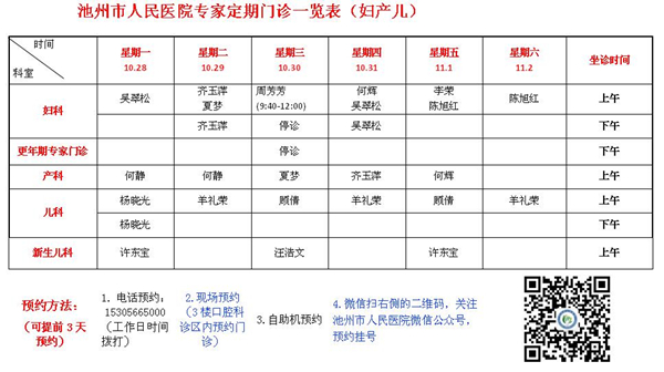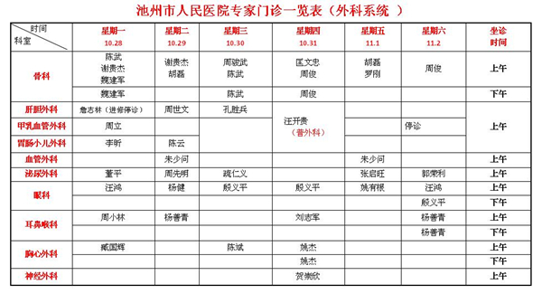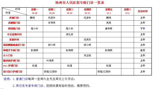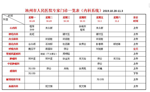 专家专病门诊排班表10月28日-11月3日
